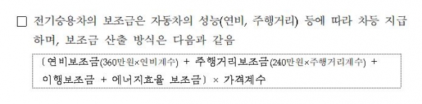 보조금에는 복잡한 계산 공식이 숨어있다. 전기 승용차, 승합차, 화물차 모두 방식이 다르다. 전기 승용차 기준 보조금 산출 방식은 아래와 같다.