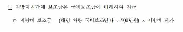 지자체 보조금 계산은 간단하다. 어려운 부분은 국비가 다 담당했다. 차량 국비보조단가를 700만 원(국비보조금 최대치) 나눈 후 지방비 단가를 곱하면 된다. 미니 일렉트릭을 서울 기준으로 하면 (572만 원÷700만 원)X200만 원=163만 원이 나온다. 국내에서 가장 많은 보조금을 지원하는 경북 울릉군을 기준으로 하면 898만 원이다. 지방비 단가만 1100만 원으로 바꾸면 된다.