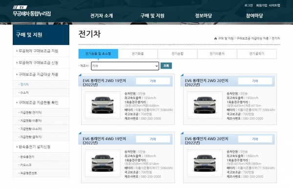 보조금과 관련된 정보를 가장 쉽고 확실하게 알 방법은 환경부 무공해차 통합누리집(www.ev.or.kr)이다. 홈페이지 접속 후 구매 및 지원 탭에서 확인할 수 있다. 보조금 외에도 지원현황, 지급 차종 등 관련된 정보를 확인할 수 있다.