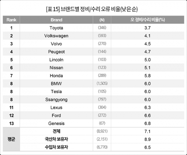 '문제 원인을 잘못 파악해 엉뚱한 곳을 정비한 일이 있다'는 설문 조사에서는 토요타가 3.7%로 가장 낮았다. 이어 폭스바겐 4.1% 볼보 4.5%로 순이었다. 국내 브랜드중에선 쌍용차가 6.0%로 8위를 기록하며 10위권 안에 랭크되었다.