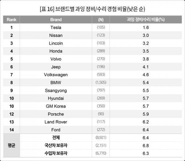 과잉정비/수리 경험 비율은 6.4%였다. 그 중 테슬라가 1.6%로 가장 낮은 수치를 보여 눈길을 끌었다. 전 라인업이 전기차인 테슬라의 브랜드 특성상 부품 가짓수가 현격히 적어 이런 수치로 나타난 것으로 보인다.