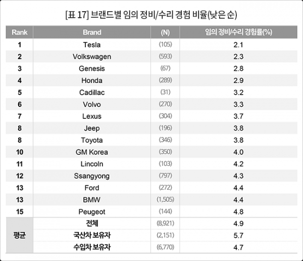 정비업체에서 사전 고지없이 임의로 정비, 수리한 경험의 비율은 4.9%에 달했다. 테슬라가 가장 낮았고 다음으로는 폭스바겐(2.3%), 제네시스(2.8%), 혼다(2.9%) 순이었다.