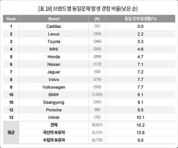 정비 이후에도 동일한 증상이 재발된 경우는 10.2%로 나타났다. 캐딜락이 0.0%로 1위를 기록했다. 다음으로는 렉서스(2.2%)였다. 인피니티의 경우 무려 10.1%의 소비자가 정비 이후에도 동일한 고장을 경험한 것으로 조사됐다.