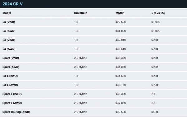 혼다는 2.0리터 하이브리드를 1.5 터보보다 더 합리적인 선택이라고 강조하면서 현재 CR-V 판매량의 절반 이상이 하이브리드 모델이라고 밝혔다. 안타깝게도 전반적으로 가격이 상승해 2023년식 CR-V보다 더 많은 비용을 지불해야 한다.