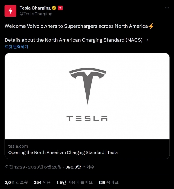 볼보자동차가 테슬라의 '북미 충전 표준(North American Charging Standard, 이하 NACS)'을 채택하겠다고 28일 발표했다. 테슬라 NACS를 공식 선택한 자동차 제조사로는 포드, GM, 리비안에 이어 4번째이다. 유럽 자동차 제조사 중에서는 최초다. 추가로 스텔란티스도 동참을 검토하고 있다.