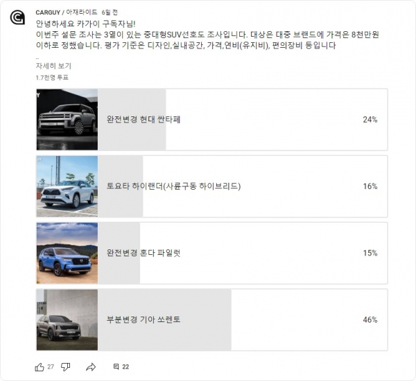 자동차 전문매체 카가이(carguy.kr)는 8월4일부터 9일가지 5일간 ‘8000만원 이하의 중·대형 SUV’의 선호도 설문조사를 진행했다. 카가이 유튜브 구독자(약 8만5천여명)가 대상이다. 설문에는 1772명이 참여했다. 선택지는 올 하반기 시장에 나왔거나 출시 예정인 3열이 있는 중대형 SUV다.