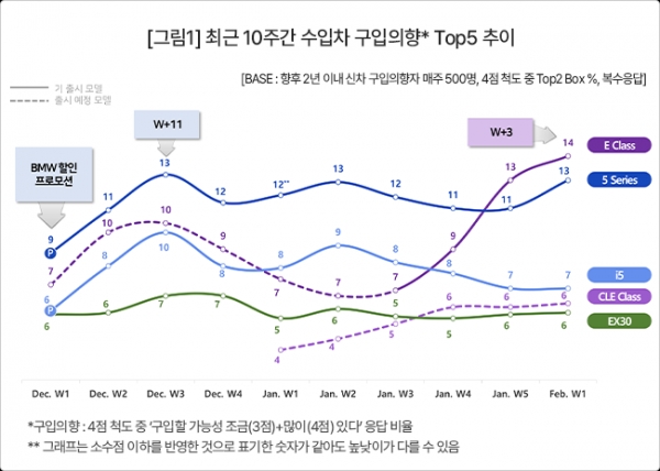 2월 1주(2월 5일 시작 주) 수입차 구입의향 1위는 지난 1월 19일 출시된 벤츠의 11세대 ‘E클래스’(14.0%)가 차지했다[그림1]. 작년 10월 출시된 BMW의 5시리즈(13%)와 전기차 모델 i5(7%)가 각각 2, 3위였고, 벤츠의 CLE 클래스와 볼보 EX30(6%)가 그 뒤를 이었다. 벤츠와 BMW가 수입차 톱5에 각각 2개 모델씩 포함시키며, 치열한 경쟁을 하고 있다.