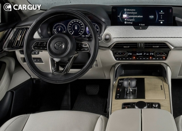 실내에는 CX-60과 마찬가지로 계기판, 인포테인먼트 시스템을 동일하게 적용하지만 플래그쉽인 만큼 천연가죽, 패브릭 소재를 이용해 고급감을 강조했다. 아마존 알렉사 AI 음성 컨트롤, 온라인과 오프라인 서비스를 모두 지원하는 내비게이션, 트레일러 뷰 시점을 지원하는 어라운드뷰 시스템 등 최신 편의장비를 모두 적용했다.