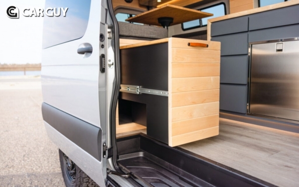 캠핑카 1열은 벤츠 스프린터 밴 모델과 동일하다. 2열로 들어서면 마치 안방에 들어온 듯한 안락함을 느낄 수 있다. LED조명, 발틱 버치 합판, 고급 바닥 장판, 슬라이드 서랍, 히든 냉장고 등 여러 수납공간과 편의장비를 준비했다. 모든 장치들은 주행 중 파손되지 않게 단단히 고정시킬 수 있다.