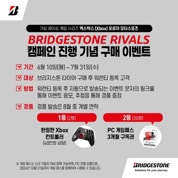 브리지스톤의 국내법인 브리지스톤 타이어 세일즈 코리아(이하 브리지스톤)가 브리지스톤의 포르자 레이싱 게임 시리즈 참가를 기념해 타이어 구매 고객을 대상으로 경품 이벤트를 시작한다.