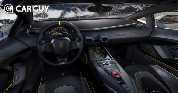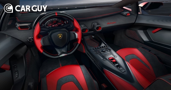 인테리어는 차체와 동일한 색상으로 레드 컬러의 가죽과 특별한 자수가 대조를 이룬다. 대시보드는 람보르기니 로고를 중심으로 레드 컬러와 블랙 컬러가 대비를 이루며 강렬함을 더한다.