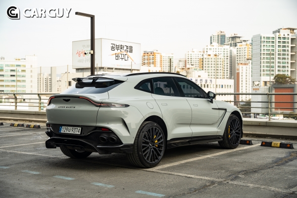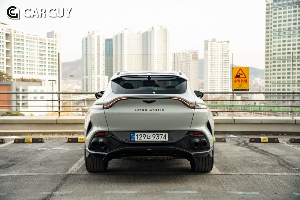 후면부는 DBX 707에서만 볼 수 있는 빵빵한 뒷 휀다와 4발의 배기구, 공격적인 디퓨저와 ‘오리꼬리’가 연상되는 스포일러가 최강의 성능을 발휘하는 애스턴마틴의 직관적 디자인으로 손색이 없다. 뒷면이 가장 아름다운 SUV 슈퍼카로 DBX를 꼽을만 하다.