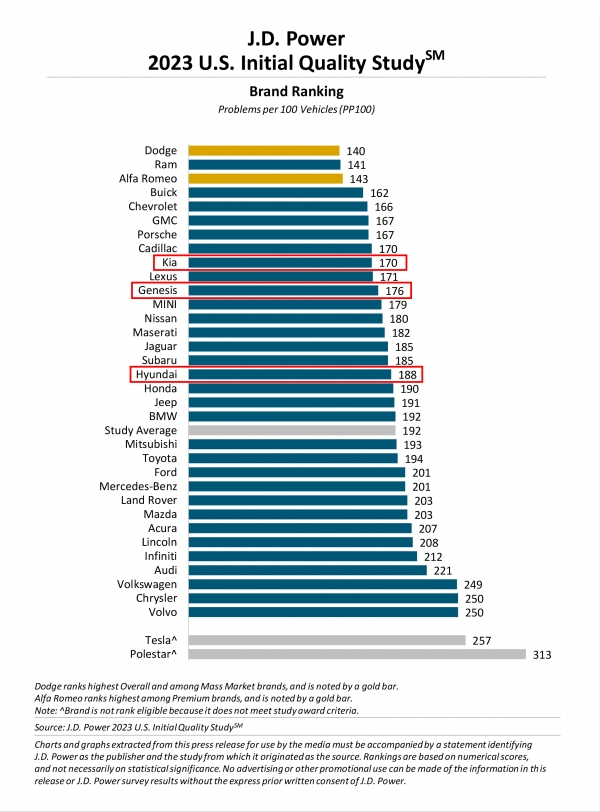 지난 22일, 미국 자동차 조사업체인 J.D. 파워가 ‘2023년 신차품질조사(Initial Quality Study, IQS)’ 결과를 발표했다. 신차품질조사는 그 해 연식의 신차를 구매, 렌트, 리스한 소유주에게 9개 부문, 223개 항목에서 경험한 품질 불만을 조사한다. 100대당 품질 문제 발생 건수를 점수화해 순위를 결정한다. 이 결과는 미국 소비자들이 신차를 구매할 때 중요한 판단 기준이 된다.