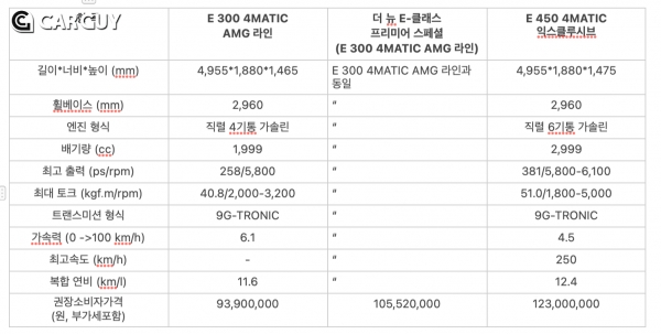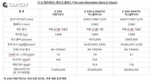 더 뉴 E-클래스의 국내 출시 라인업과 가격 및 제원은 아래와 같다. 보다 자세한 사항은 전국 메르세데스-벤츠 코리아 64개 공식 전시장 및 메르세데스-벤츠 코리아 공식 홈페이지(www.mercedes-benz.co.kr)를 통해 확인할 수 있다.