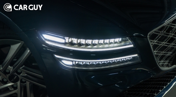 헤드램프는 G90 RS4에 들어간 MLA 방식의 LED로 변화를 줬고 제네시스 상징인 크레스트 그릴은 이중 매쉬 구조로 다듬어 더욱 디테일이 좋아졌다. 또한 기요세 패턴이 적용된 플랫한 디자인의 신규 알루미늄 엠블럼도 소소한 디테일의 변화다. 전면 범퍼는 보다 스포티한 인상으로 날카롭게 바뀌었다.