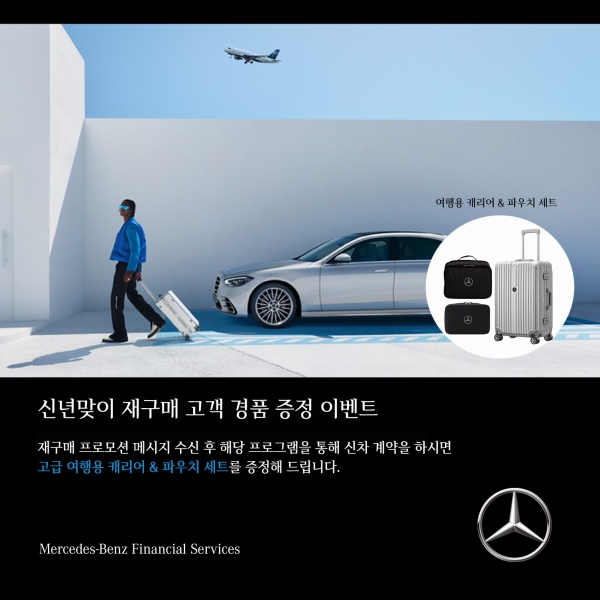 더불어 신차 추가 구매 또는 다른 차량으로 교체 등 메르세데스-벤츠 파이낸셜 서비스 코리아의 금융상품을 재이용하는 고객에게는 금리 인하 및 중도 상환 수수료 면제 혜택이 주어진다. 재이용 고객 중 메르세데스-벤츠 파이낸셜 서비스 코리아가 발송하는 본 프로모션 안내 메시지를 수신한 고객에게는 여행용 캐리어와 파우치 세트로 구성된 고급 트래블 키트를 추가 증정할 예정이다.