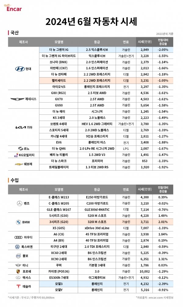 국내 최대 자동차 거래 플랫폼 엔카닷컴(대표 김상범)이 2024년 6월 중고차 시세를 공개했다. 이번에 공개된 중고차 시세는 엔카닷컴 빅데이터를 토대로 현대자동차, 기아, 르노코리아자동차, KG모빌리티 등 국내 완성차 브랜드와 벤츠, BMW, 아우디 등 수입차 브랜드의 2021년식 인기 차종 중고차 시세를 분석한 결과다. 주행거리 기준은 60,000km이며 무사고 차량을 대상으로 분석했다.
