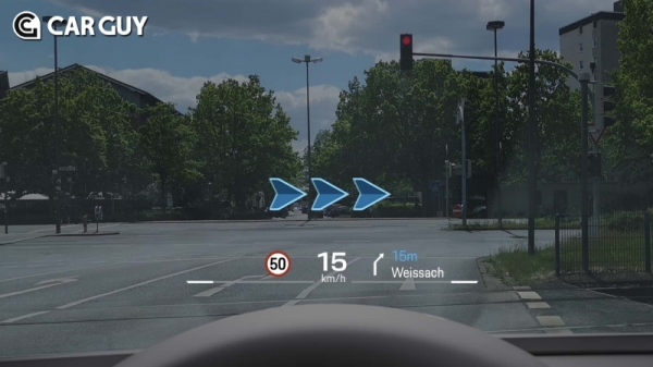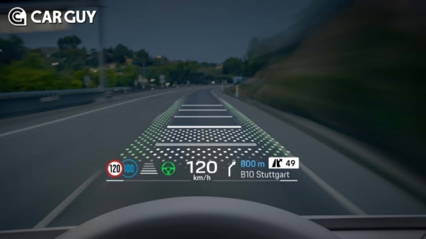 증강현실 헤드업 디스플레이는 87인치 거대한 화면을 전면 유리창에 띄워놓은 것으로 운전자가 전면 도로 상황을 가시적으로 확인할 수 있게 도와준다. 차량이 차선을 벗어나고 있는지, 차로의 중앙을 제대로 유지하고 있는지를 직관적으로 보여준다. 또한 앞차와의 거리 계산을 통해 브레이크 페달을 밟아 제동시 예상거리를 운전자 시야에 맞게 직관적으로 제공한다.