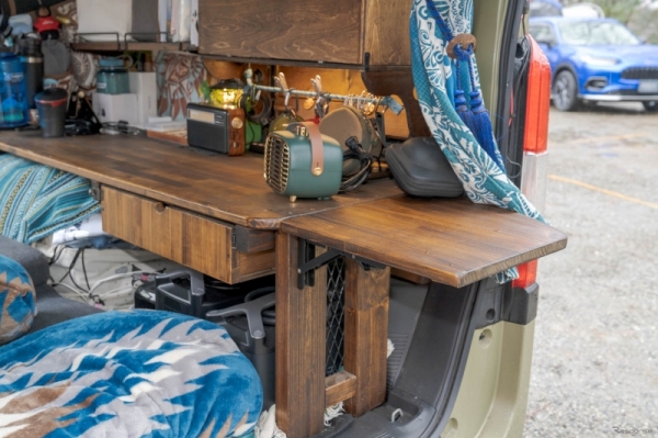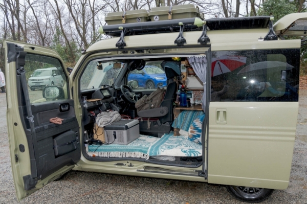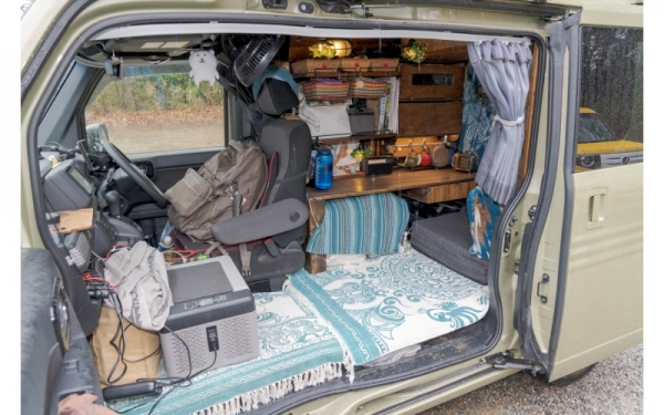 처에 루이씨는 100엔 샵(국내 다이소와 저가 생활용품 판매점)에서 물품을 구입하거나 주변에서 쉽게 구할 수 있는 아이템을 이용해 실내를 개조했다. 그는 "대충 개조한 상태로 2년간 지내보다가 아예 DIY로 차박 전용차로 만드는 게 낫다는 결론을 내렸다”며 "차내에 어떻게 설치할 지 실내 공간을 어떻게 활용할지 고민해 직접 목재를 구입해 1개월 만에 완성했다"고 설명했다.