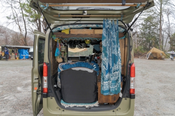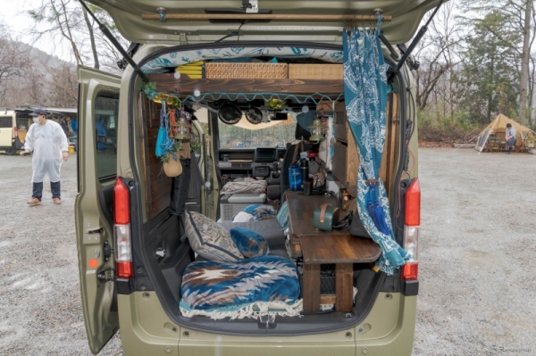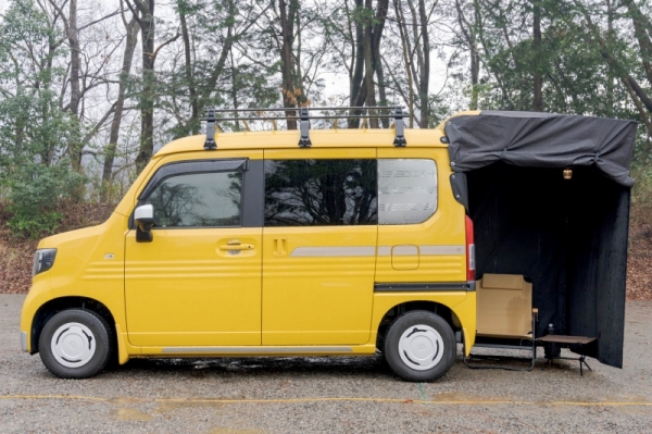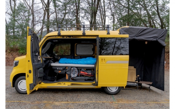 혼다의 경형 미니밴 N박스를 이용해 1년에 300일 정도를 차박으로 사용해 화제다. 혼다의 악세서리 제조사 ‘혼다액세스’가 개최한 아웃도어 전시회에 등장한 차박 전용 N박스는 DIY로 자체 제작해 웬만한 살림살이를 갖춰 눈길을 끌었다.