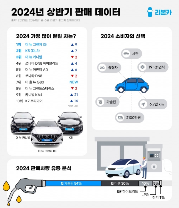 비대면 직영인증중고차 플랫폼 리본카가 2024년 상반기 중고차 판매 데이터를 분석한 결과 판매량이 전년 동기 대비 42% 증가한 가운데 ‘더 뉴 그랜저IG’가 가장 많이 판매된 것으로 나타났다.