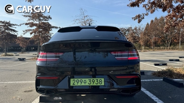 이 차는 특별한 디자인을 갖춘 차다. 쿠페는 기존 GV80의 멋진 디자인을 그대로 이어받아 트렁크 쪽 지붕 일부를 잘라내고 덕테일 스포일러를 장착했다.