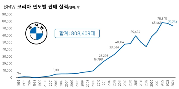 BMW코리아는 2011년 2만대를 처음 돌파한 데 이어 2013년 3만대, 2014년 4만대를 넘어섰다. 2024년까지 누적 판매량은 80만8409대다.