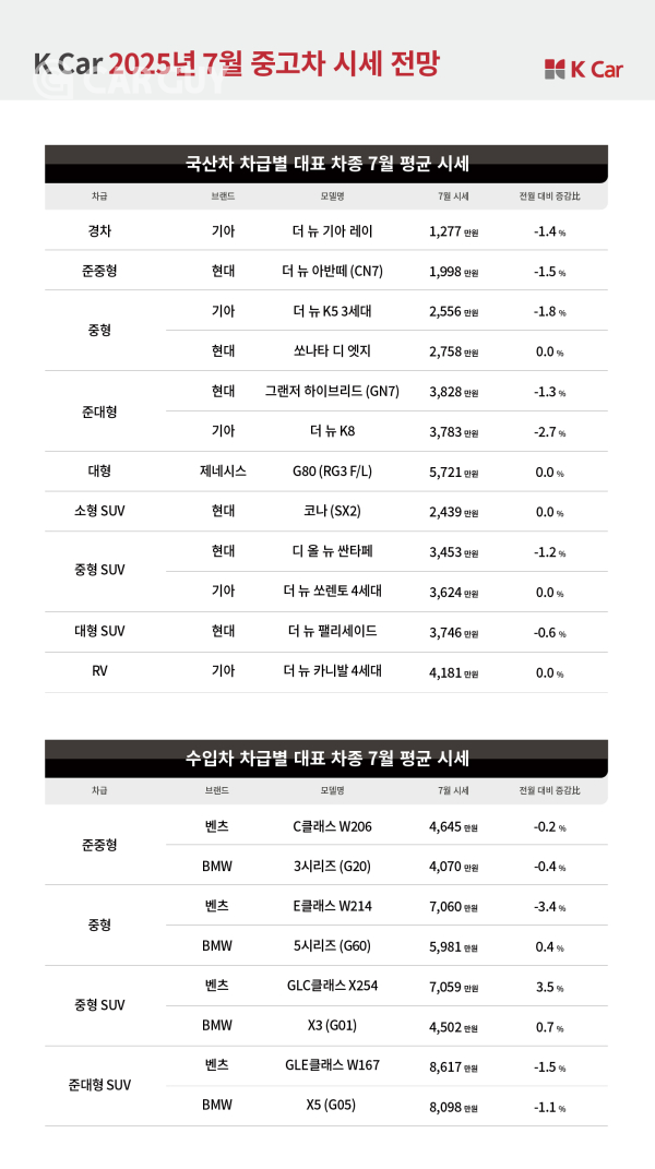 조은형 케이카 PM팀 애널리스트는 ”7~8월은 중형 SUV와 다목적 차량인 RV의 성수기로 주요 모델의 시세가 상승 또는 유지되는 경향이 나타났다“며 “시장내 물량 증가에 따른 국산 준대형 세단의 시세가 당분간 약세를 보일 것으로 예상되므로 구매를 고려하는 고객들에게는 좋은 기회가 될 수 있다“고 설명했다.