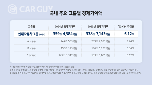 기업데이터연구소인 CEO스코어가 500대 기업(공기업·금융사 제외) 가운데 사업보고서를 제출한 2024년 매출액 상위 100대 기업을 대상으로 분석한 결과, 국내 그룹 중 현대차그룹(9개사)의 경제기여액이 359조 4,384억원으로 가장 큰 것으로 나타났다.