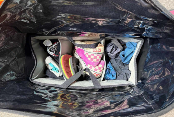 남부 캘리포니아 여행을 위해 옷, 여분의 라이딩 장비, 그리고 플러그 키트, 공구, 타이어 공기 주입기 같은 필수품을 싣고 다녔다. 방수 롤탑 디자인으로 쉽게 넣고 뺄 수 있다.