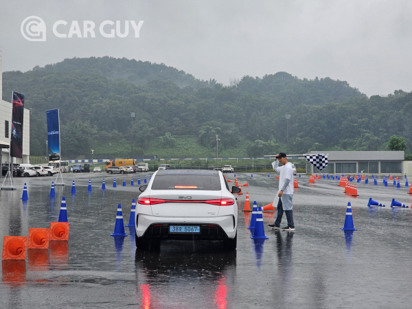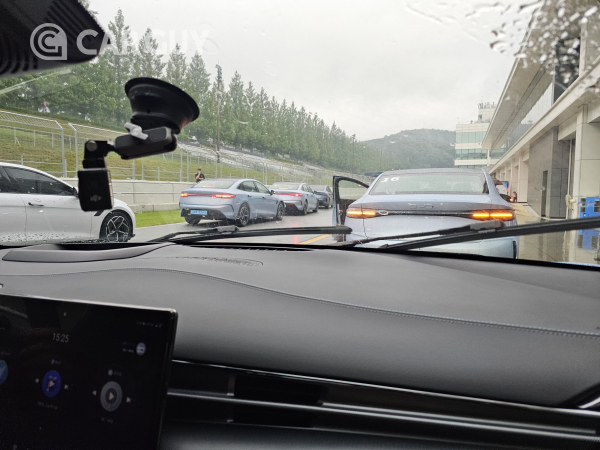 이어 트랙 주행에 나섰다. 하필 소나기 수준의 비가 쏟아져 한계까지 주행을 하지는 못했다. 와이퍼가 최고 속도로 작동되는 상황에서 코너와 직선 주로를 다양하게 공략했다. 제로백이 3.8초인 만큼 많은 기대를 했다.