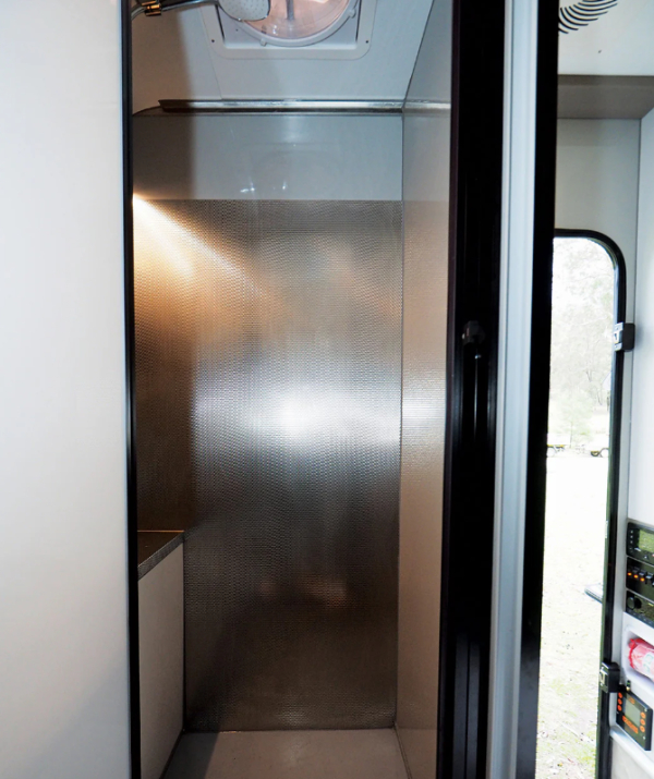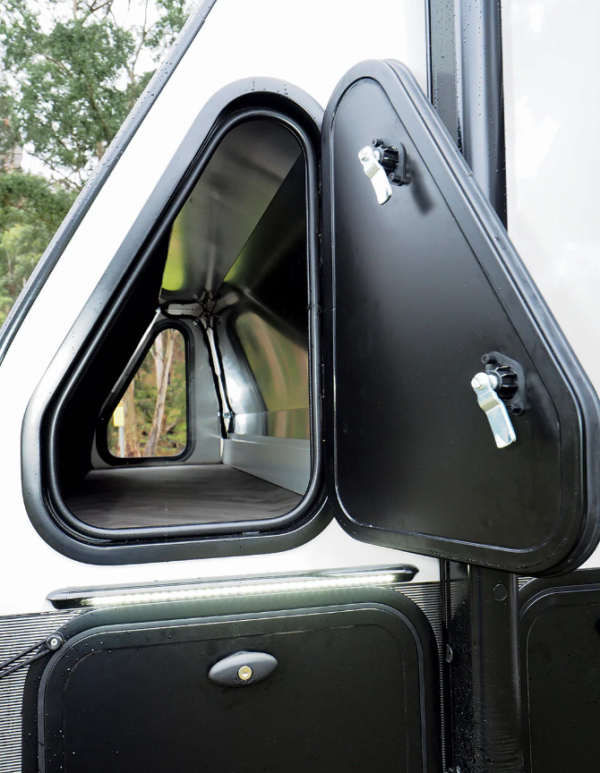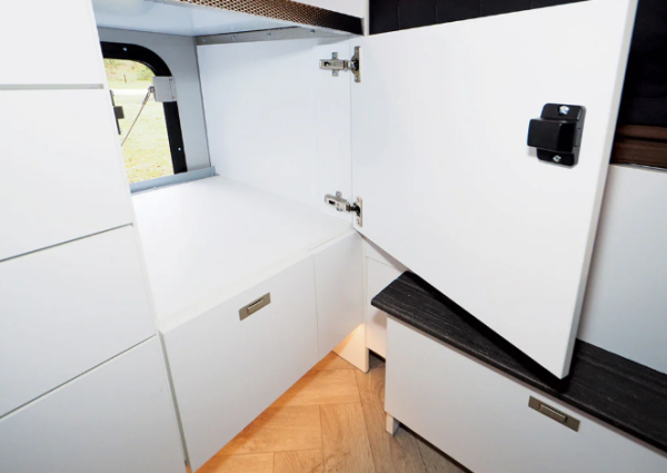 앞쪽 터널 수납공간은 냉장 및 냉동고를 넣을 만큼 넉넉하다. 특히 밴 앞쪽에 내장된 위아래 수납공간이 매력이다. 또 다른 훌륭한 특징은 중간 벽에 내장된 외부 팬트리다.