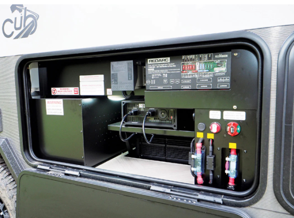 조리와 관련하여 외부 주방은 듀얼 존 인덕션 쿡탑, 스테인리스 스틸 싱크대, 그리고 수저용 서랍 두 개로 꾸며져 있다. C18의 전기 시스템은 인상적이다. 3000W 인버터를 탑재한 배터리 관리 시스템(BMS)과 REDARC 종합 차량 관리 시스템(TVMS)이 장착되어 있다.