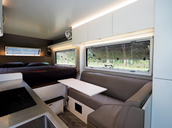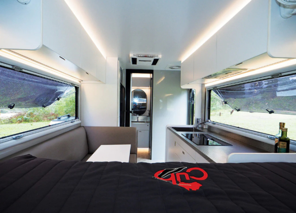 침대 아래쪽에는 충전 포트가 몇 개 있다. 반대쪽 탑승자는 히터를 조절할 수 있다. 벽면을 따라 위치한 주방 조리대는 인덕션 쿡탑과 사각 싱크대가 있어 보기에는 심플해 보이지만 다른 컵 캐러밴처럼 매우 실용적이다.