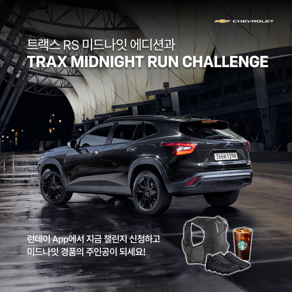 ‘트랙스 미드나잇 런 챌린지’는 4백만 명 이상의 누적회원을 보유하고 있는 국내 최고 보이스 코칭 달리기 앱인 ‘런데이’와의 협업으로 진행되는 고객 참여 프로그램이다. 관심 고객은 ‘런데이’ 앱을 통해 8월 1일부터 8월 7일까지 이벤트 참여를 신청할 수 있으며, 미션 기간인 8월 8일부터 8월 21일까지 제안된 미션을 수행하면 된다. 쉐보레는 주어진 미션을 완수한 참가자 중 추첨을 통해 ▲On 러닝화, ▲살로몬 러닝 조끼, ▲스타벅스 아메리카노 쿠폰 등 다양한 블랙 테마의 경품을 제공할 계획이다.