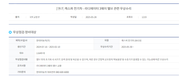 캐스퍼 일렉트릭은 2024년 7월 국내 사전계약을 시작했다. 출시 1년 시점에서 다수의 무상수리 내역이 진행되고 있다. 그 중 가장 이슈인 부분은 3웨이 밸브 관련이다.