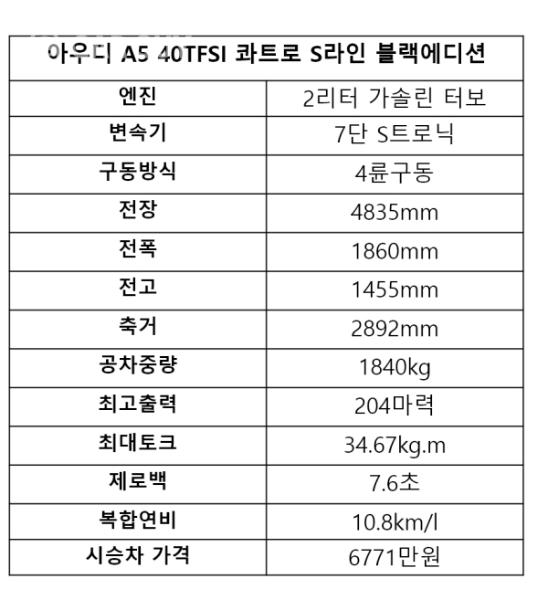다만 블랙에디션의 경우 경쟁사 E세그먼트와도 가격이 일부 겹치는 등 가격이 비싼 편이다. 더구나 100여만원을 추가하면 옵션은 일부 빠지지만 성능을 높인 45 TFSI 콰트로 S라인을 구입할 수 있다. 종합 경쟁력에서 45모델의 선택이 더 합리적으로 보인다. 안정적인 주행감이 매력인 만큼 고성능 S5 시승에 기대감이 높아졌다.