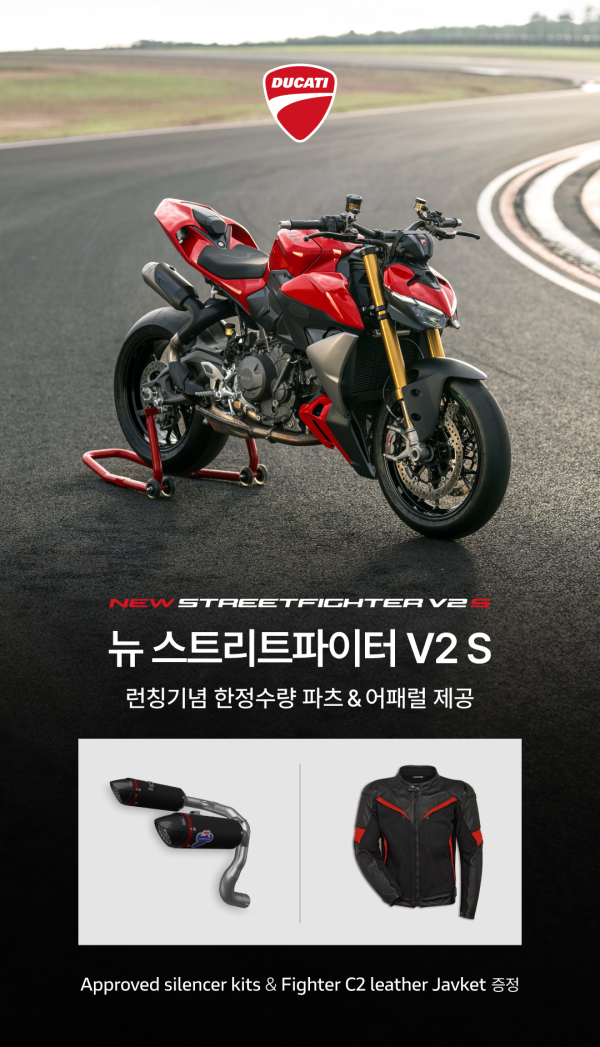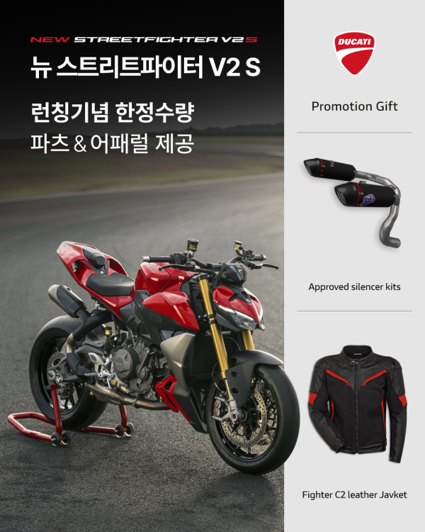 두카티 코리아(www.ducati-korea.com)가 2025년에 국내 런칭한 뉴 스트리트파이터 V2 S의 성공적인 출시를 기념해 특별 프로모션을 진행한다. 이번 프로모션은 한정 수량으로 제공되며, 차량 구매 고객을 대상으로 약 420만 원 상당의 두카티 퍼포먼스 파츠와 어패럴을 증정한다.