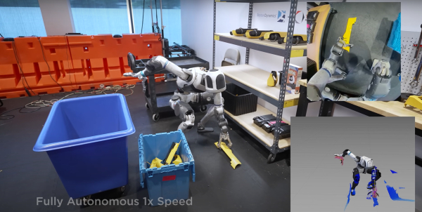 또한, 아틀라스는 스팟의 다리 부품을 들어서 접은 다음 정확히 선반 위에 정렬하고, 또다른 부품을 선반 최하단의 박스에 넣는 작업도 선보였다. 아틀라스는 부품이 선반에 걸려 박스에 바로 넣을 수 없을 것으로 판단, 박스를 앞으로 꺼내 적재한 뒤 다시 제자리로 옮기는 똑똑함도 보여준다.