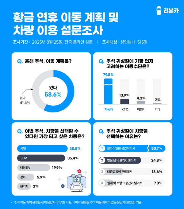 리본카는 추석 황금연휴를 맞아 소비자들의 차량 이용 실태를 파악하고자 성인남녀 515명을 대상으로 온라인 설문을 진행했다. 응답자 중 58.6%인 302명이 귀성 또는 장거리 이동 계획이 있다고 답했으며, 이들을 대상으로 추가 설문을 진행했다. 이번 조사는 장거리 이동 시 소비자의 니즈와 고려 요소를 파악해 서비스 개선에 반영하기 위해 기획됐다.