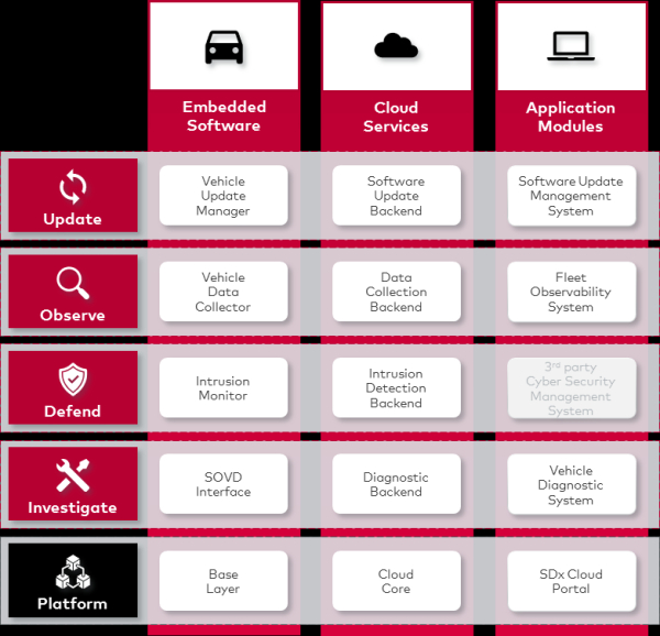 SDx Cloud은 OTA소프트웨어 업데이트, 원격 진단, 차량-클라우드 통신 인터페이스 관리, 침입 탐지, 디바이스 및 서비스 관리 등의 기능을 제공한다.
