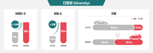 먼저 다양성 키워드는 국내에 판매되는 수입 승용차의 브랜드와 모델 수, 차종 등에서 확인할 수 있다. 2003년에서 2025년 사이 국내에 판매하는 수입 승용차 브랜드는 16개에서 약 1.6배 늘어난 26개로, 판매 모델 수 역시 170여 종에서 520여 종 이상으로 약 3배 증가했다. 국산 승용차 모델수가 120여종인 점을 고려할 때 수입차의 다양성이 소비자들의 선택지를 크게 확대시켰다.
