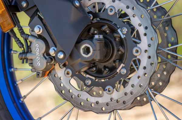 도로에서 속도를 줄이면 강력하지만 특별히 날카롭지는 않은 제동 반응이 드러난다. 이는 282mm 트윈 로터, 4피스톤 브렘보 캘리퍼, 그리고 패드 컴파운드가 오프로드 성능을 염두에 두고 튜닝되었다. 스포츠바이크에서 기대할 수 있는 날카로운 초기 반응은 접지력이 낮은 다양한 노면에서는 유리하지 않다.
